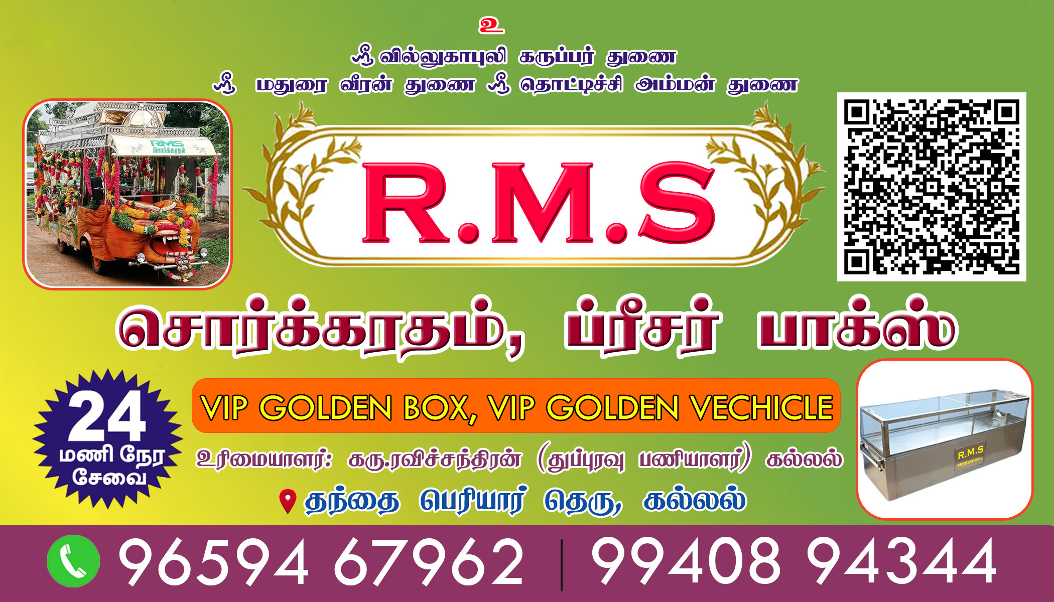 சொர்க்க ரதம், ப்ரீசர் பாக்ஸ், பந்தல், சேர் வாடகைக்கு கிடைக்கும். (விஐபி கோல்டன் பாக்ஸ், விஐபி கோல்டன் வாகனம்)