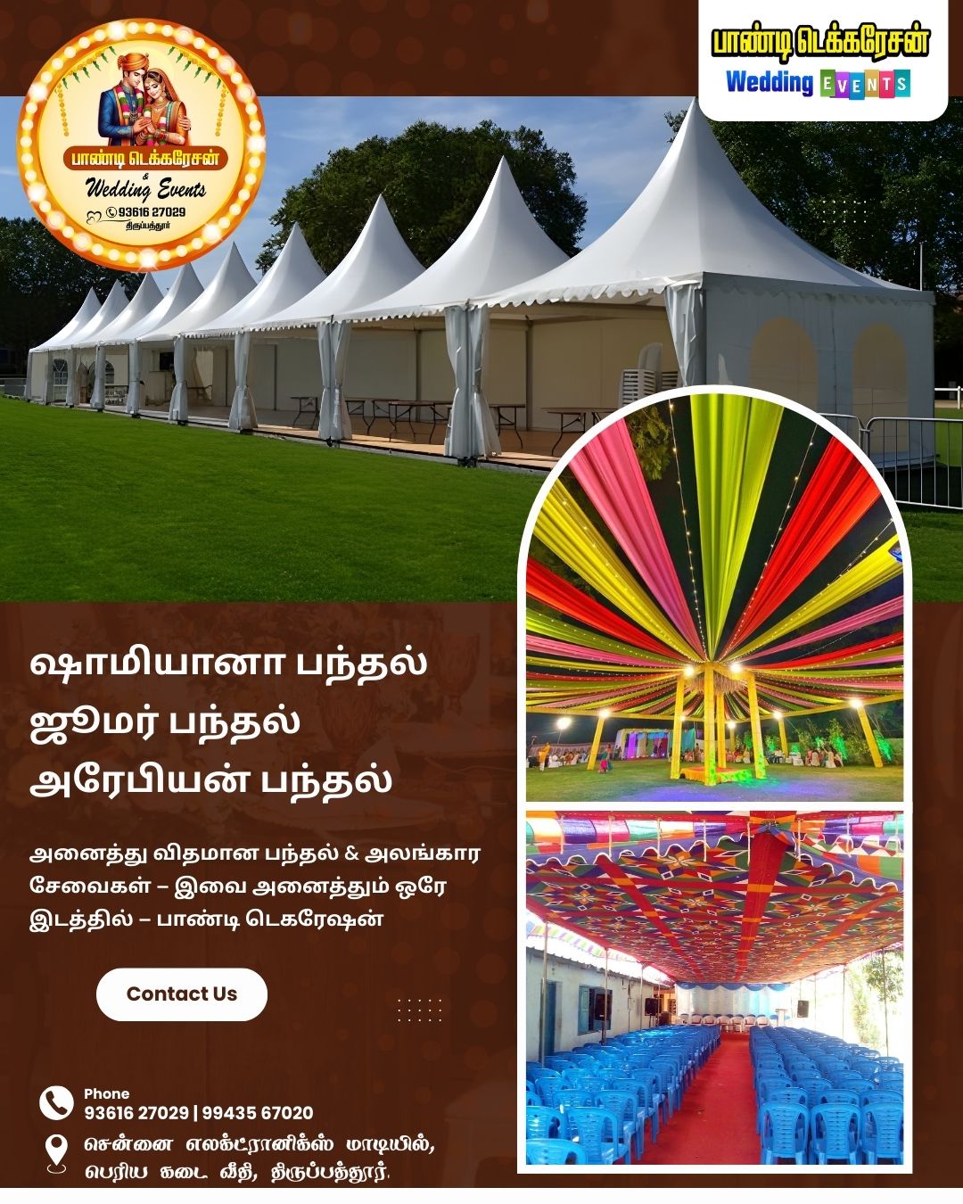 டெக்கரேசன், லைட்டிங், DJ, பிறந்தநாள் டெக்கரேசன், ஐஸ் கிரீம், சாமியானா பந்தல்கள், திருமண ஆர்க்கெஸ்ட்ரா, புரூட் சேலட்